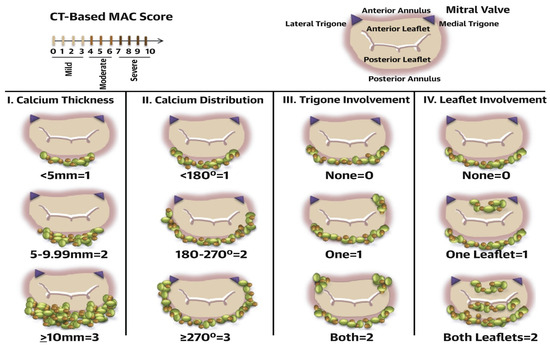 Elements used in the MAC score and their corresponding points. Average annulus calcium thickness (<5 mm = 1 point, 5 to 9.9 mm = 2 points, ≥10 mm = 3 points); calcium distribution in annulus circumference (<180° = 1 point, 180° to 270° = 2, ≥270° = 3); trigone calcification (none = 0, anterolateral = 1, posteromedial = 1); and mitral leaflet calcification (none = 0, anterior = 1, posterior = 1). A severity grade is assigned based on total points accumulated as follows: mild MAC = 3 points or less, moderate MAC = 4 to 6 points, and severe MAC ≥ 7 points. CT = computed tomography; MAC = mitral annular calcification. Reproduced with permission from Guerrero et al [31]., A Cardiac Computed Tomography–Based Score to Categorize Mitral Annular Calcification Severity and Predict Valve Embolization, JACC: Cardiovascular Imaging, Volume 13, Issue 9, September 2020, Pages 1945–1957. Copyright [2020] [American College of Cardiology Foundation].
