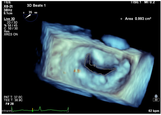 MVA measurement using 3D TEE planimetry. (MVA: mitral valve area, 3D TEE: three-dimensional transesophageal echocardiography).