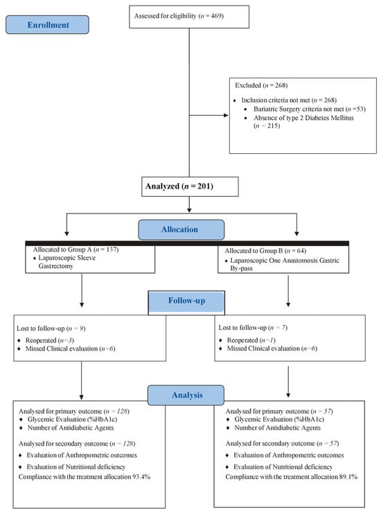 This study is reported according to the STROBE statement for cohort studies [18]. A retrospective monocentric study was conducted to compare the efficacy of SG vs. OAGB in the remission of DMII, in patients affected by obesity and diabetes. It was conducted according to the ethical principles stated in the Declaration of Helsinki. Written informed consent was obtained from all patients.