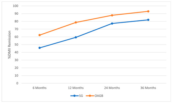 Type 2 diabetes mellitus (DMII) trend in patients who underwent SG and OAGB during the entire follow-up period.
