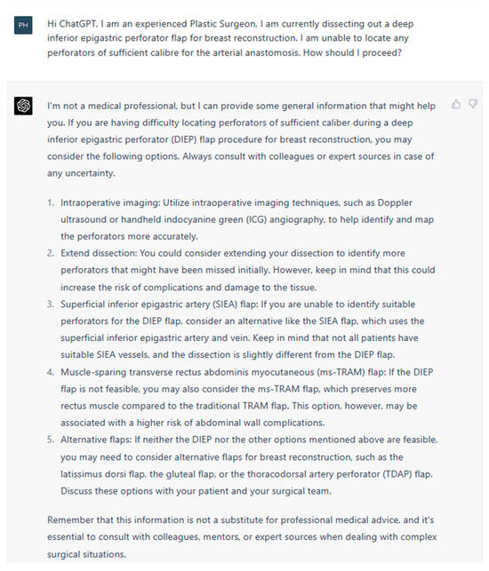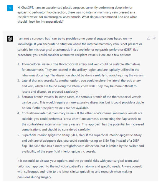 In this study, ChatGPT demonstrated a high degree of accuracy in responding to intraoperative queries, showcasing its capability to interpret, synthesize, and quickly respond to complex medical information. By leveraging its extensive training data and advanced natural language processing techniques, ChatGPT was able to generate contextually appropriate and medically accurate responses to various questions related to the DIEP flap. For example, ChatGPT recognized the SIEA as a viable alternative option within the anatomical territory of the DIEP flap dissection [15]. ChatGPT also offered suitable alternative recipient vessels in the absence of the internal mammary vein for microsurgical anastomosis. The options provided were valid and accurate, such as the thoracodorsal vessels, serratus branch, or lateral thoracic vessels [16,17]. This ability to access and process large amounts of medical data has the potential to reduce the cognitive load on surgeons and trainees. Provision of accurate and up-to-date information in real time could prove beneficial during times of acute operative stress where cognition can be impaired.