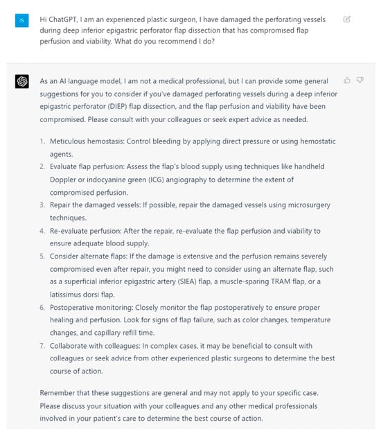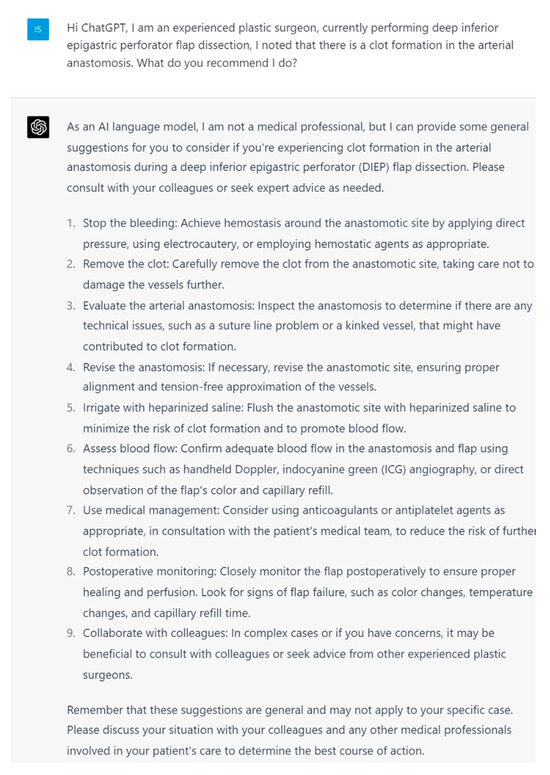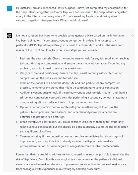 However, it is essential to note that the ChatGPT system is not without limitations, and in certain instances we found the responses lacking in detail. During postoperative monitoring, for example, ChatGPT advised close monitoring of the flap for healing and perfusion; however, it did not define what parameters of temperature, color, and capillary refill time changes would be concerning for flap failure [18,19]. In other circumstances, the chatbot provided responses that were not contextually relevant or specific to the DIEP flap procedure. For example, interrogation of flap perfusion via Doppler or indocyanine green is not routinely performed intraoperatively [20]. This highlights the need for further refinement and customization of AI-driven chatbots for application in specialized medical fields.