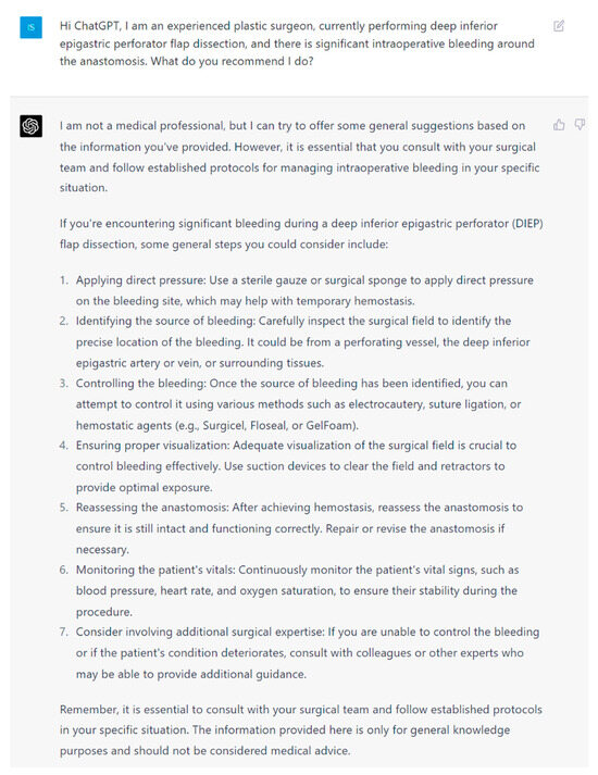 Furthermore, ChatGPT demonstrated an understanding of critical issues that must be addressed promptly to ensure patient safety and the success of the procedure. For example, when questioned about intraoperative bleeding, it formulated a focused and systematic approach to apply direct pressure, identify the source of bleeding, and employ appropriate techniques such as electrocautery, suture ligation, or hemostatic agents. It emphasized basic surgical principles of broadening the field of visualization. It also provided logic to reassess the anastomosis, ensuring preservation of the flap, and recommendations of postoperative monitoring of the patient’s vital signs.