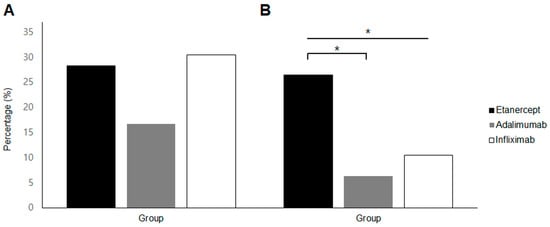 Regarding new-onset uveitis, during the first two years of TNFi therapy, the percentages of patients developing AU were 26.4% (14 patients) for etanercept, 6.3% (2 patients) for adalimumab, and 10.5% (2 patients) for infliximab. Significant differences were found among the three groups (p = 0.040), with the etanercept group showing a higher incidence of new-onset AU compared to the adalimumab group (p = 0.024; Figure 1B).