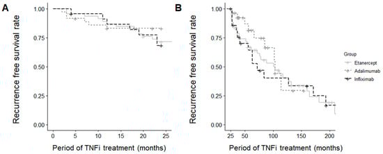 Survival analyses showed no significant differences in AU recurrence during the first two years of TNF inhibitor therapy (p = 0.549) or the subsequent period (p = 0.614) among the three treatment groups (Figure 2).