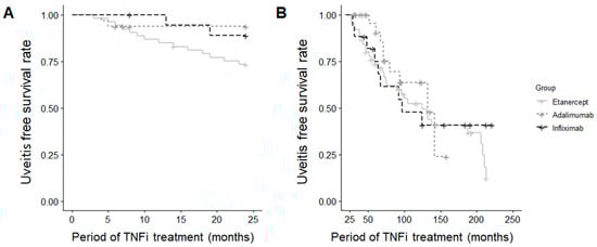Survival curve for uveitis occurrence (A) within the first 2 years and (B) beyond 2 years in new-onset cases.