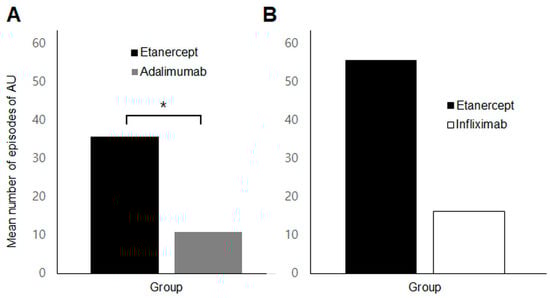 Comparison of the mean number of episodes of anterior uveitis per 100 patient-years in the switching group (A) Comparison of etanercept and adalimumab in patients who switched between the two agents (B) Comparison of etanercept and infliximab in those who switched between the two. * p value < 0.05.