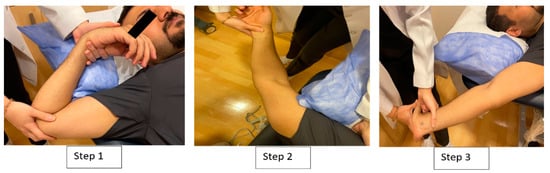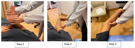 The participants in this group received the distal-to-proximal sequence, which started with wrist and fingers’ extension, progressed to forearm supination and extension, and ended with shoulder depression, abduction, and external rotation [28]. The therapist performed 10 shoulder abduction/adduction movements while maintaining the test position for rest of the joints. Four series of 10 tensioning movements, with a rhythm of approximately 6 s per cycle and a 1 min rest between each series, were performed. After each cycle of 10 repetitions, the position was held for 10 s (Figure 2).