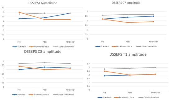 Further analysis of the PTD group revealed a notable decline in DSSEP amplitudes at the C6, C7, C8, and T1 levels, amounting to 27%, 27%, 29%, and 16%, respectively (p < 0.05) compared to the baseline measurements (Figure 4). This reduction was observed when comparing baseline measurements with post-intervention measurements. In contrast, during the same period, the DTP group exhibited an increase in DSSEP amplitudes at C6, C7, C8, and T1 by 7%, 44%, 27%, and 27%, respectively. Similarly, the Standard group demonstrated amplitude increments in DSSEPs at C6, C7, C8, and T1 by 4%, 6%, 0%, and 1%, respectively. These specific changes and their magnitudes can be found in greater details in Table 2 and Table 3.