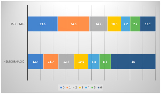 With regard to quality indicators for the prevention of in-hospital complications in our registry, dysphagia screening was low, ranging from 21.6% to 41.6% for IS and HS, respectively. Dysphagia screening is essential in patients with acute stroke, since swallowing difficulties are present in up to 67% of stroke patients and consist of a prerequisite for aspiration pneumonia which subsequently increases the risk of mortality [23]. Venous thromboembolism (VTE) prophylaxis with LMWH was started more often in IS compared to HS patients (65% vs. 39.4%). The latter, if left untreated, may lead to pulmonary embolism which accounts for nearly 10% of deaths after stroke [23]. In this context, both dysphagia screening and VTE prophylaxes have been endorsed by international major stroke quality improvement organizations to ensure optimization of provided healthcare quality [24,25]. In our registry, 65% of IS patients received VTE prophylaxis in a similar [26] or even higher [27] proportion than other large registries whereas dysphagia screening was underused as it has been previously documented, albeit to a greater extent in our cohort [14,26]. Potential explanations for this include the tendency to perform screening only in patients with severe strokes at high risk for aspiration, the absence of consensus regarding the most appropriate screening tool and the significant shortage of medical and nursing personnel during this period as many physicians and nurses were allocated in COVID-19-treating wards [23].