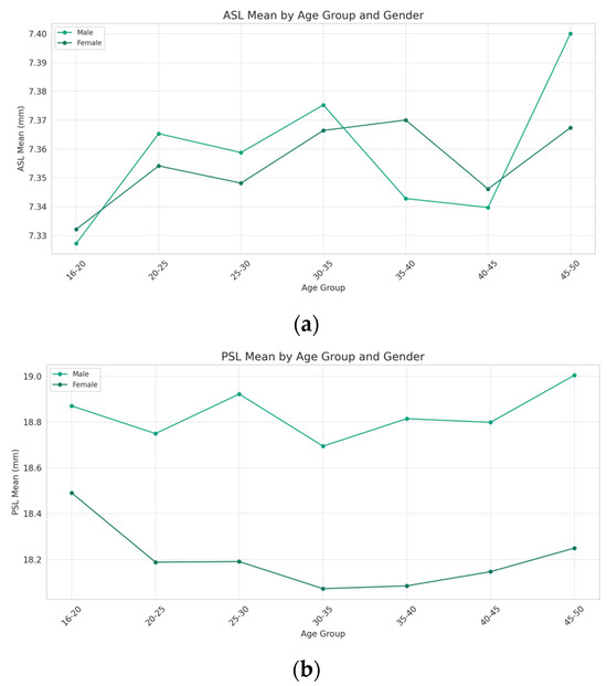 Comparisons of ASL and PSL stratified by age and sex. The (a) ASL and (b) PSL trends demonstrate an age-related increase for both genders, with notable gender-specific variations. Males generally exhibit higher ASLs and PSLs than females across age groups, except for the 35–40 and 40–45 groups. Males show consistent PSL growth, while females have a decrease until the 35–40 group, followed by a significant rise at 45–50.