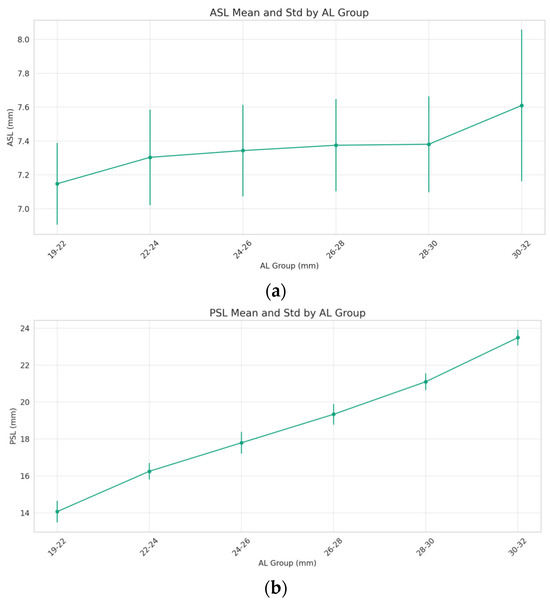 The ASL presents a gradual increase as the AL extends from 19 mm to 32 mm. This relationship is not linear, as evidenced by a notable surge in the ASL for the AL 30–32 mm group. The variability within each AL group, represented by the error bars, suggests a consistent range of ASL measurements across most AL categories, with a pronounced increase in variability in the 30–32 mm group (Figure 3a). The PSL ascends steadily as the AL increases. This trend demonstrates a robust correlation, where a longer AL is associated with a greater PSL. The standard deviation within each AL category remains relatively uniform, implying a consistent relationship between the AL and PSL across the spectrum (Figure 3b). ANOVA test was conducted, indicating significant differences in the ASL and PSL measurements across the different AL groups (both p < 0.001).