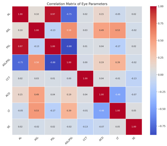 A strong positive correlation is observed between the AL and the PSL, as indicated by a coefficient close to one. Conversely, there is a strong negative correlation between the AL and the ASL/PSL ratio, denoted by a coefficient nearing −0.75. The ACD and LT both exhibit a moderate positive correlation with the ASL. The LT shows a strong negative correlation with the ASL/PSL ratio. As the LT increases, the anterior segment lengthens, but this does not necessarily translate to an increase in the posterior segment’s length. The CCT shows very little to no correlation with the other parameters, implying that the corneal thickness is independent of axial dimensions and segment lengths within the eye. The SE does not exhibit significant correlations with the axial dimensions.