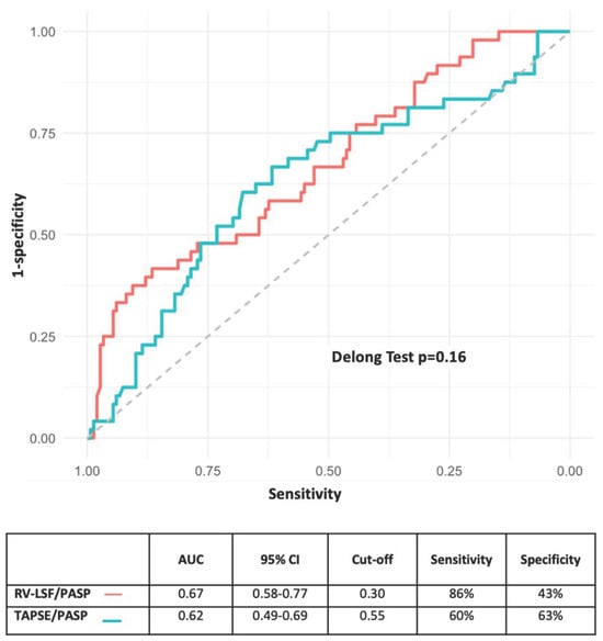 ROC curve analysis has shown that RV-PA coupling parameters are underperforming in identifying patients who experienced 6-month MACE (all AUC < 0.7). The comparison of AUC values revealed no significant difference between the parameters (AUC = 0.67, 95%CI = [0.58–0.77] vs. 0.62, 95%CI = [0.49–0.69]; p = 0.16, respectively). The optimal threshold for identifying patients with a 6-month MACE event using RV-LSF/PASP was 0.30%.mmHg−1, resulting in a sensitivity of 86% and a specificity of 43%. In contrast, the TAPSE/PASP ratio’s threshold value was 0.55 mm.mmHg−1 (see Figure 2).