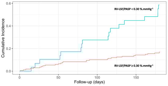 The 6-month cumulative risk of MACE was 59% (95%CI at [38–74]) with RV-LSF/PASP < 0.30%.mmHg−1 and 17% (95%CI at [12–23]) with RV-LSF/PASP ≥ 0.30%.mmHg−1 (p < 0.0001, Figure 3).