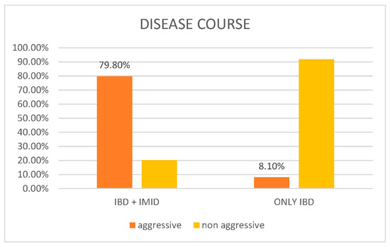 Aggressive disease was defined as the need for more than two steroid cycles for IBDs, the need for immunosuppressors or target therapy for IBDs, the need for hospitalization for IBD relapse, the need for surgery, or the persistence of invalidating symptoms (diarrhea, abdominal pain, blood in stools, fever, nausea, or vomiting) for 12 months despite therapies. The presence of only one of these criteria was suggestive of aggressive disease [15]. To assess the impact of concurrent IMIDs, a control group of IBD patients without associated IMIDs was considered. For the control group, data about age, sex, diagnosis (Crohn’s disease, ulcerative colitis, or undefined IBD), smoking habits, disease location, and perianal disease were collected.