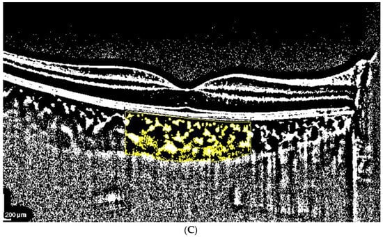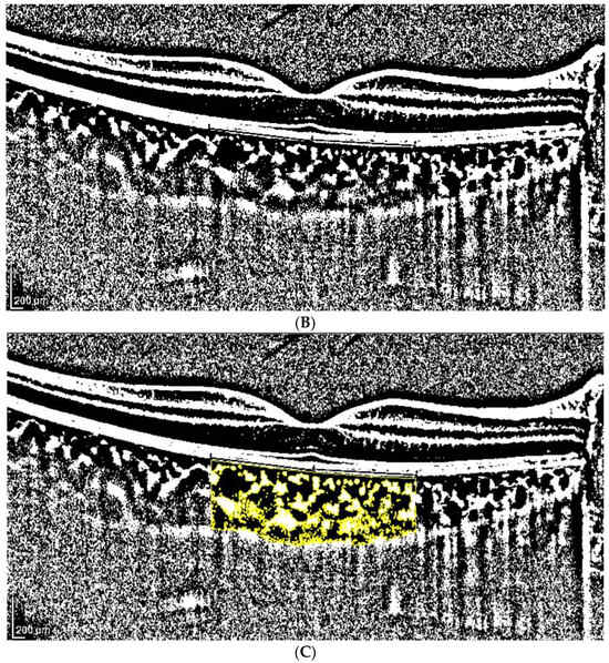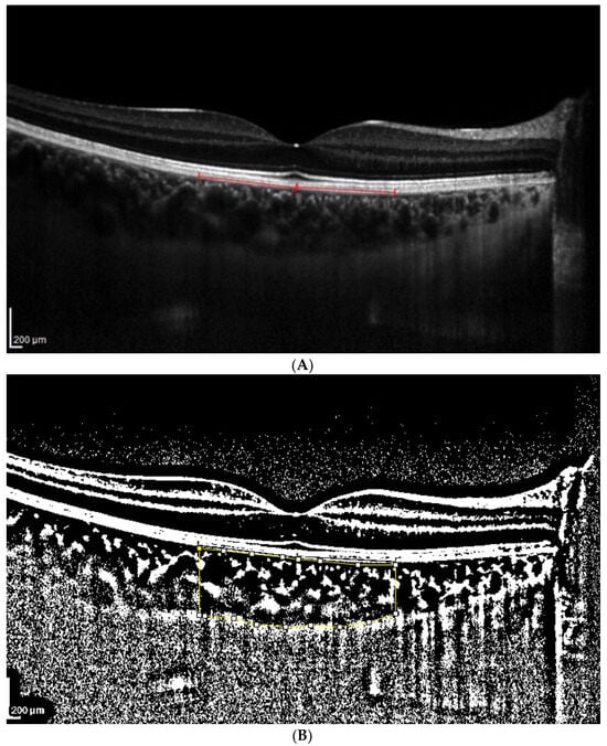 Initially, ChT was thought to be used as an indicator of both systemic and ocular individual health status, because changes in this parameter have been observed in many pathological disorders [,,,,]. Lindner et al. found a thinner choroid in 72 eyes of 72 patients with geographic atrophy (GA) compared to 37 eyes of 37 healthy patients and a correlation between ChT and the GA subtype, showing that ChT reflects the disease’s heterogeneity []. Young et al. showed a progressive choroidal thinning in 22 eyes of 11 patients with clinically inactive uveitis, such as birdshot chorioretinopathy []. Kim et al. studied 235 eyes of 145 patients, 40 of whom underwent a laser panretinal photocoagulation (PRP), while 195 were treatment-naïve and categorized based on the presence and severity of diabetic retinopathy. They demonstrated a direct proportionality between ChT and the severity of diabetic retinopathy; moreover, they demonstrated a thicker subfoveal choroid in patients with diabetic macular edema and the thickest ChT in edemas with subretinal detachment []. De Bernardo et al. studied 25 eyes of 25 patients undergoing alpha-lytic therapy and 25 eyes of 25 healthy controls, both programmed for cataract surgery in the fellow eye. They found a decrease in ChT and no floppy iris syndrome during surgery in patients after drug withdrawal []. De Bernardo et al. explored 64 celiac patients and 67 healthy subjects and found that the subfoveal TCA, LCA, SCA and subfoveal ChT, but not CVI, were significantly different between the two groups []. However, further studies showed that ChT cannot be considered a valid marker, because it is too susceptible to biological variables, such as intraocular pressure or AL, which present an inverse correlation with ChT [,,]. Moreover, it is well known that AL measurements are not very precise, and the use of correcting formulas in AL measurements could change this finding []. Another limitation of ChT measurements is that no information on vessels or stromal changes can be obtained []. To overcome these problems, a new parameter, namely CVI, was subsequently introduced by Agrawal et al. []. In their studies, the choroidal image was acquired again using the EDI-OCT mode, in particular, by first scanning the macular region and then binarizing it according to the Sonoda et al. protocol, making minor changes []. This results in a black and white image, on which three components can be identified: the TCA, LCA and SCA.