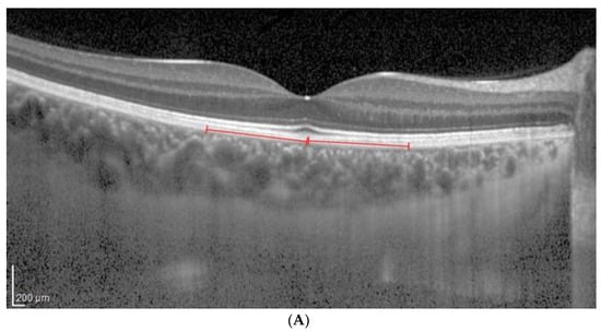 In 2008, Spaide et al. [] proposed an EDI-OCT system. They obtained an inverted representation of the choroid using an SD OCT device that was close enough to the eye of healthy volunteers without causing pupillary dilation. This was an innovative method to better visualize and measure ChT in vivo. Then, Tian et al. presented a fast and accurate algorithm to segment and quantify the choroid either manually or through specific algorithms []. Analyzing high-contrast choroidal cross-sectional images, the complex of pixels with the biggest gradient value above the RPE was identified as Bruch’s membrane; then, using Dijkstra’s algorithm, the shortest path on the graph formed by the valley pixels was detected and identified as the choroidal–scleral interface [].