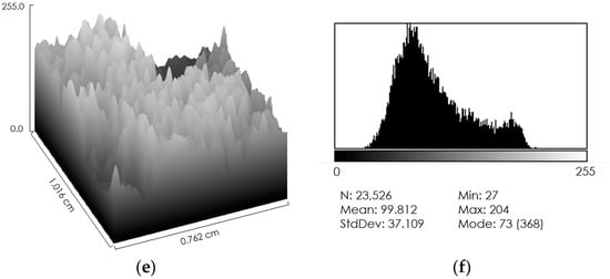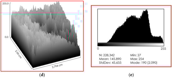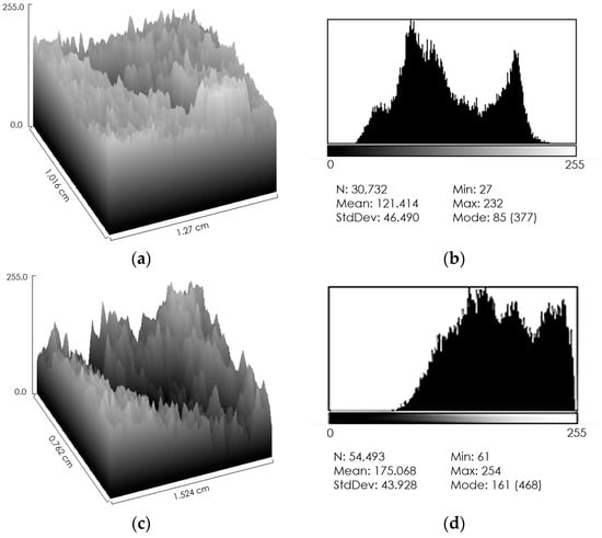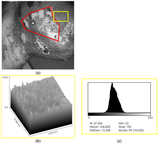 To verify the effectiveness of the method, smaller areas with different types of dyschromia were selected: an area that presented both hyper- and hypopigmentation (Figure 3a—dotted selection), an area with hypopigmentation only (Figure 3a—*), and an area with hyperpigmentation only (Figure 3a—#). Both the three-dimensional reconstruction and the calculation of the distribution of grey levels were performed, confirming the correspondence of depressions for hypopigmentation and bumps for hyperpigmentation (Figure 4).