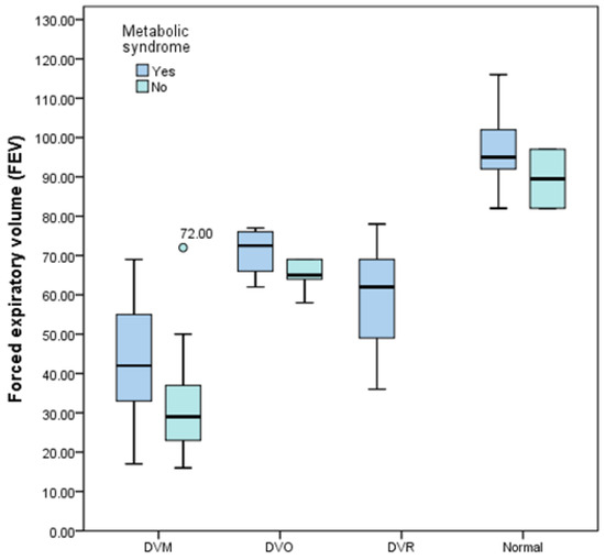 Those presenting 5 and 4 criteria are mostly male, generally having a body mass index > 25.00. The higher the number of fulfilled conditions, the lower the mean FEV1 values (Figure 6). As patients meet a greater number of metabolic syndrome conditions, there is a tendency for an increase in BMI and a decrease in FEV1, but also an increase in pulmonary dysfunctions (DVO, DVR, DVM). Patients with a low metabolic syndrome score (0 and 1) have increased FEV1 values, and those with a high metabolic syndrome score (4 and 5) tend to have a more pronounced pulmonary function impairment.