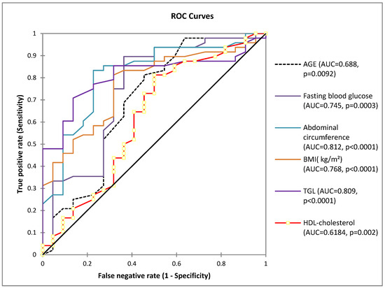 The ROC curve highlighted that age, with a probability of 68.8%, has an important role in the occurrence of metabolic syndrome (Figure 2). The optimal cut-off value of age to detect the metabolic syndrome with maximum sensitivity and specificity was 57 years old, with a positive predictive value (PPV) of 79.5% and a negative predictive value (NPV) of 57.1%. For fasting blood glucose, the optimal cut-off value was 98 (mg/dL), positive predictive value (PPV) 84.3%, and negative predictive value (NPV) 73.6%. For abdominal circumference, the optimal cut-off value was 89 cm, positive predictive value (PPV) 88.8%, and negative predictive value (NPV) 68.0%. For TGL, cut-off value was 105 mg/dL, the positive predictive value (PPV) was 91.8%, and the negative predictive value (NPV) was 57.5%.