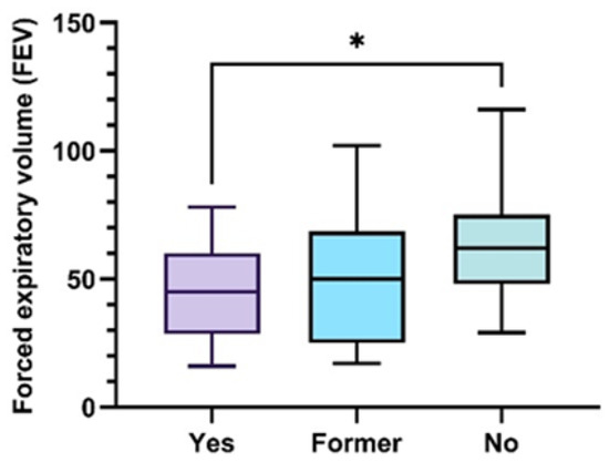 A strong negative correlation was found between the habit of smoking (smokers or ex-smokers = Former) and the FEV1 value (F = 3.494, p = 0.040), smoking being an important risk factor for obstructive pulmonary disease (Figure 3).
