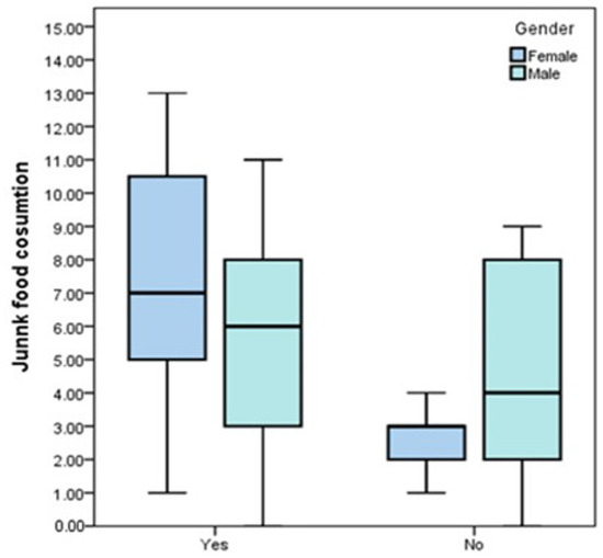 The statistical outcomes regarding the consumption frequency of soft drinks are derived from two-sided tests. During the conclusive phase of the analysis, we investigated the relationship between the variable “Quantity of junk food” and independent variables, including gender and BMI groups. The statistical analysis employed XLSTAT (version 2020, Addinsoft, New York, NY, USA) for Correspondence and the Statistical Package for the Social Sciences, version 23 (SPSS Inc., Chicago, IL, USA). A significance threshold of p < 0.05 was considered for statistical significance [30,31,32].