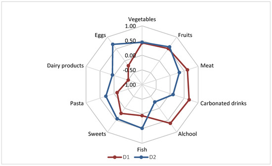 Exploratory factor analysis was performed to identify underlying dietary patterns using the average portions consumed. Bartlett’s test of sphericity (p = 0.010) supported the appropriateness of factor analysis. D1 (Metabolic syndrome-YES) had high positive loadings on alcohol and carbonated drinks, and negative loading on dairy products. D2 (Metabolic syndrome-NO) was characterized by high positive loadings on fish, eggs, and pasta (Figure 5).
