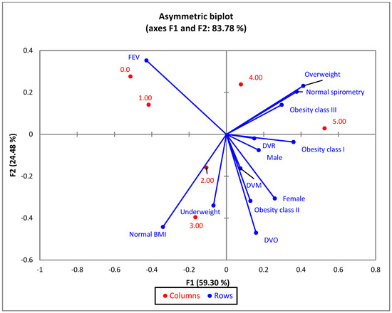 Correspondence analysis (CA) was conducted for variables of BMI, gender, spirometry, and the number of met metabolic syndrome conditions.