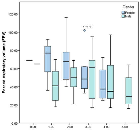 Box-and-whisker graph of FEV1 depending on the number of met metabolic syndrome risk criteria and gender.