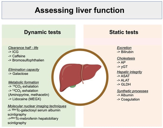 Comparison between dynamic and static liver function tests and a respective selection of test examples, modified according to Sakka et al. [15]. ICG = indocyanine green; AP = alkaline phosphatase, γ GT = gamma-glutamyltransferase; ASAT = aspartate transaminase; ALAT = alanine transaminase; GLDH = glutamate dehydrogenase (figure generated using BioRender©).