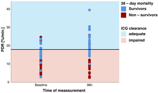 Significant differences between the survivors and non-survivors regarding their mean values could be found after 96 h: survivors had a higher PDR (21.9 ± 6.3%/min vs. 9.2 ± 6.3%/min; p < 0.05) than non-survivors. Survivors showed a significant improvement of ICG clearance within 96 h after baseline: PDR (+7.3 ± 6.3%/min vs. −2.9 ± 2.6%/min; p < 0.01) (Figure 4).