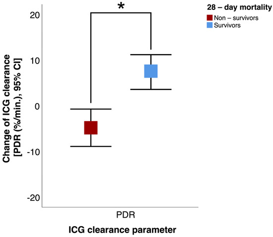 Change in indocyanine green (ICG) clearance (PDR, plasma disappearance rate) from baseline to 96 h in survivors and non-survivors. CI = confidence interval. * p < 0.05.