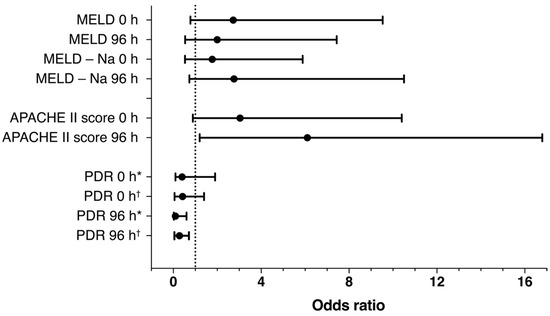 Forrest plot of binary logistic regression at baseline and after 96 h regarding the prediction of 28-day mortality. The following cut-offs were used for calculation: Acute Physiology and Chronic Health Evaluation (APACHE) II score: 33 points, Model of End Stage Liver Disease (MELD) score: 15 points; MELD-Na score: 17 points. Adjusted for APACHE II and MELD and MELD-Na scores at baseline or 96 h, respectively (* unadjusted; † adjusted).