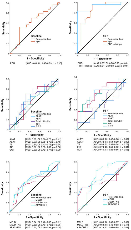 Receiver operating characteristic (ROC) curves of the indocyanine green PDR (plasma disappearance rate), as well as selected conventional parameters of liver function at baseline and after 96 h regarding the prediction of 28-day mortality. GGT = gamma-glutamyl-transferase; ASAT = aspartate transaminase; ALAT = alanine transaminase; INR = international normalized ratio; TB = total bilirubin; MELD = Model of End Stage Liver Disease; Na = sodium; APACHE II = Acute Physiology and Chronic Health Evaluation II.