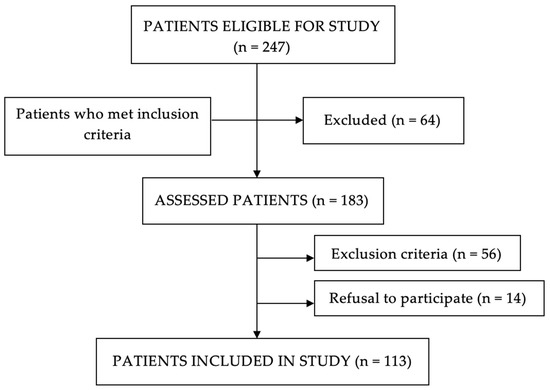 Inclusion and exclusion criteria were applied after selecting eligible patients for the study. Patients who met those criteria were included in the study. A total of 113 patients were recruited (Figure 1).