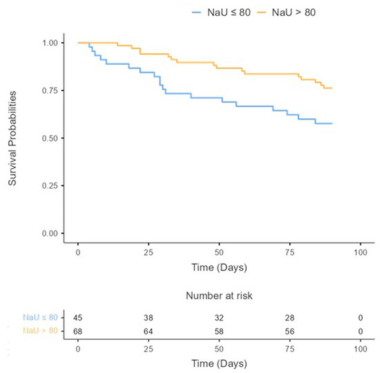 During the follow-up period (90 days), a total of 19 patients (16.8%) died, 22 patients (18.6%) were readmitted for HF, and a total of 35 (31%) achieved the primary endpoint (ACM and/or HF rehospitalization at 90 days). Kaplan–Meier curves and a log-rank test showed significant differences between groups. Patients with a poor diuretic response (NaU ≤ 80 mmol/L) experienced a higher proportion of events (Log-rank test = 0.020) (Figure 2).