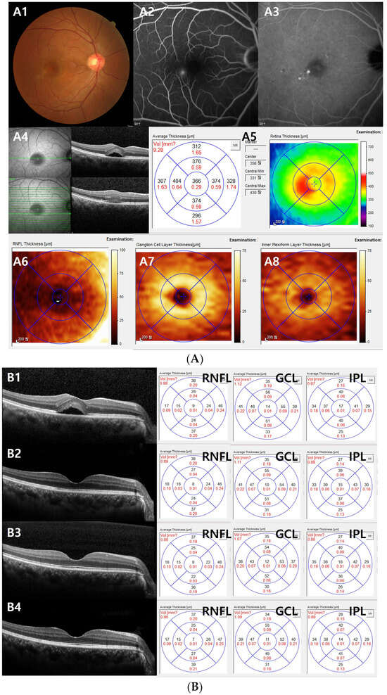 (A) Representative case of a 48-year-old male patient with acute central serous chorioretinopathy (CSC). (A1) Color fundus photography, (A2) fluorescein angiography (FA), (A3) indocyanine green angiography, (A4) infrared (IR) and optical coherence tomography (OCT) images, (A5) average thickness and volume of macula based on ETDRS circles, (A6) retinal nerve fiber layer (RNFL) thickness map, (A7) ganglion cell layer (GCL) thickness map, (A8) inner plexiform layer (IPL) thickness map. FA (A2) shows leakage of dye in ink blot pattern and OCT. (A4) shows increased subfoveal choroidal thickness and the presence of subretinal fluid. IR (A4) showed decreased reflectance on foveal center due to SRF. (B) This is the same case for (A). (B1–B4) Changes in the ganglion cell complex thickness after focal laser over time. With the gradual disappearance of subretinal fluid over time, RNFL, GCL, and IPL thickness remained unchanged. (B1) First visit, (B2) 1 month follow-up, (B3) 3 months follow-up, and (B4) 6 months follow-up after focal laser photocoagulation.