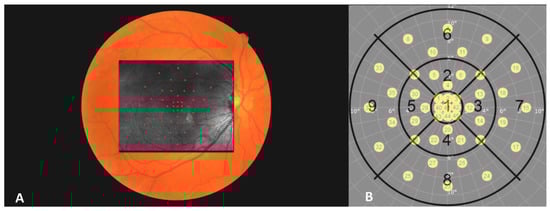Image (A) shows the color fundus image and the registered pseudo-scanning laser ophthalmoscopy image with a overlaid microperimetry testing grid. Image (B) shows the microperimetry grid with all 45 test spots and the early treatment diabetic retinopathy study grid with corresponding degrees of excentricity relative to the center.