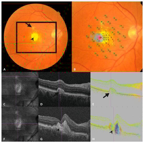 - Wu, C.Y.; Brooks, H.L.; Davis, J.L. Subretinal Exudation and Fibrosis in Relentless Placoid Chorioretinitis. Am. J. Ophthalmol. 2022, 243, e3–e4. [Google Scholar] [CrossRef] [PubMed]