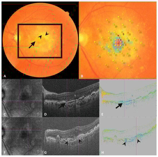 - Finn, A.P.; Pistilli, M.; Tai, V.; Daniel, E.; Ying, G.S.; Maguire, M.G.; Grunwald, J.E.; Martin, D.F.; Jaffe, G.J.; Toth, C.A. Localized Optical Coherence Tomography Precursors of Macular Atrophy and Fibrotic Scar in the Comparison of Age-Related Macular Degeneration Treatments Trials. Am. J. Ophthalmol. 2021, 223, 338–347. [Google Scholar] [CrossRef]