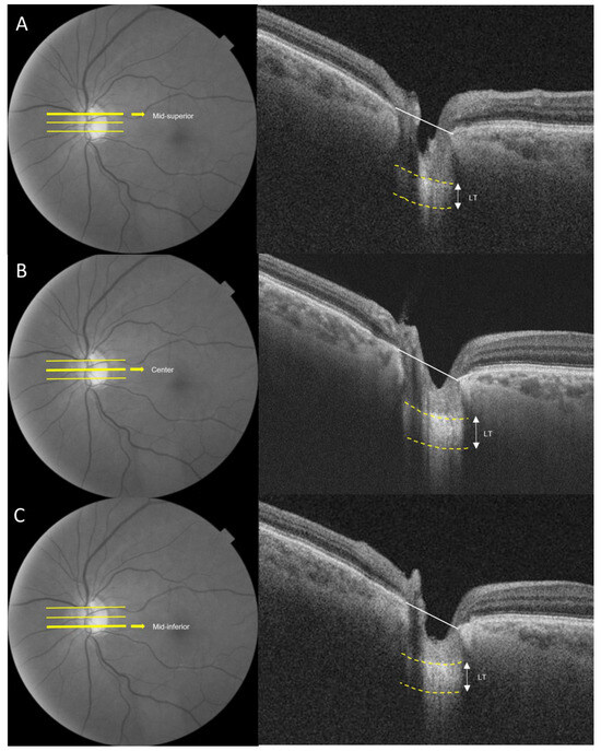 Images of the lamina cribrosa were acquired using an SS-OCT device (DRI OCT Triton; Topcon Corporation, Tokyo, Japan). SS-OCT was conducted at a scan speed of 100,000 A-scan/s and had a long wavelength that is centered at 1050 nm, surpassing the conventional Spectral domain OCT (840 nm). SS-OCT provided an approximately 8 μm axial resolution, enhancing the imaging of deep ocular structures. LT was assessed at three locations (mid-superior, center and mid-inferior) that passed through the optic nerve head. LT was measured as the distance between the anterior and posterior borders of the highly reflective region beneath the optic nerve head in a cross-sectional B-scan (Figure 1) [19,20]. Adobe Photoshop (Version 7.0, Adobe Systems, Inc., San Jose, CA, USA) was utilized to assess the anterior and posterior borders. The LT was measured using the manual caliper tool in DRI OCT Viewer (Topcon, Tokyo, Japan). Two observers (D.Y., N.Y.) independently measured LT, and each measurement was repeated twice in every B-scan. The mean of the four measurements was reported as the LT in each B-scan. To assess the intra-observer and inter-observer reproducibility of LT measurements, 25 randomly selected SS-OCT cross-sectional B-scans were evaluated, and correlation coefficients were calculated for inter-observer and intra-observer variability.