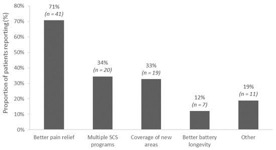 Reasons for converting to the new spinal cord stimulation implantable pulse generator (N = 58). Multiple reasons could be selected by each patient.