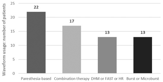 Waveform usage at last follow-up. Multiple waveforms may be used by each patient. DHM: dorsal horn modulation; FAST: fast-acting sub-perception; HR: high-rate SCS.
