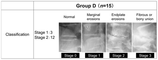 Group D consisted of 15 patients (10 males and 5 females) with a mean age of 70.4 years and a mean duration of hemodialysis of 10.8 years, and Group L consisted of 62 patients (31 males and 31 females) with a mean age of 71.0 years. The mean follow-up period was 4 years in group D and 3 years and 9 months in group L. The primary diseases that led to dialysis were diabetic nephropathy in 6 patients, chronic glomerulonephritis in 3 patients, nephrosclerosis in 3 patients, and unknown in 3 patients. The staging of group D was based on their progression classification of destructive spondyloarthropathy [10] (Figure 1), with Stage 0 being normal, Stage 1 being bone erosion of the anterior corner angle, Stage 2 being bone erosion of the vertebral body endplate and narrowing of the disc space, and Stage 3 being a loss of disc space and fusion of the vertebral body.