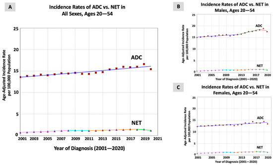 In females (219,897 patients; 42.7% of all cases), the incidence of ADC significantly increased at a steady pace through the entire study period (APC = AAPC = 0.71, p < 0.001). For NETs, the incidence rate significantly increased between 2001 and 2008 (APC = 7.37, p < 0.001), was stable between 2008 and 2011 (APC = −2.26), significantly increased between 2011 and 2017 (APC = 4.31, p = 0.006), and was stable between 2017 and 2020 (APC = −5.45, p = 0.06). When assessing the trends over the entire period, there was no significant difference in the rate of increase between NETs (AAPC = 2.74, p = 0.01) and ADC (AAPC = 0.71, p < 0.001), with an absolute AAPC difference of 2.03, p = 0.06 (Table 1 and Figure 1C).