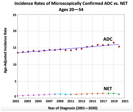 Simultaneously, there has been an increase in the incidence of colorectal neuroendocrine tumors (NETs), a CRC subtype that is typically considered rare [17,18,19]. NETs, previously known as carcinoid tumors, account for less than 1% of all CRCs, and their risk factors, management, and outcomes are distinct from those of ADC [19]. Not only does the rising incidence of NETs dictate the management of CRC, since the management of NETs is different from that of adenocarcinomas, but also it has implications regarding screening protocols, as the incidence of early-onset CRC continues to rise [20]. While prior data showed an increasing incidence of both ADC and NETs in younger adults aged 20–54 years [9], there is still a lack of research exploring the incidence of NETs compared to that of ADC in the context of early-onset CRC. Therefore, the aim of this study was to conduct a comprehensive comparative time trend analysis of the incidence rates and trends of ADC and NETs, in young adults, using the most comprehensive U.S. cancer database, i.e., the United States Cancer Statistics (USCS) database.