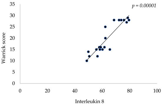 The strongest positive correlation was identified upon analyzing the relation between IL-8 and the Warrick score (r = 0.9156, p < 0.00001), signifying that high levels of IL-8 are indicative of a more severe and extensive pulmonary involvement. This correlation between cytokine levels and disease activity has also been reported by other scientific papers, though IL-8 was not the focus of the aforementioned publications [28,29], underlining the need for further research in regard to utilizing interleukins as a means for monitoring disease activity in relation to the lung, as well as a more in-depth delving into the etiological mechanisms of SS.