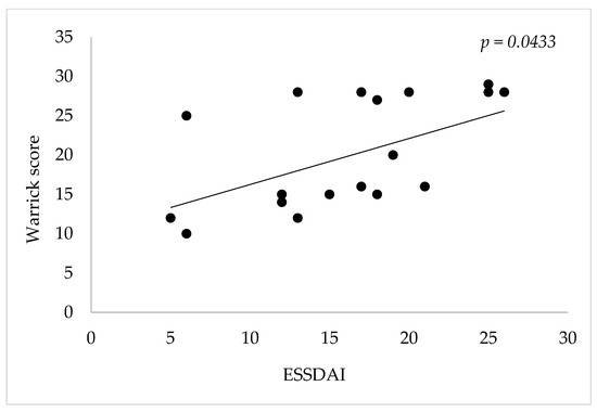 Disease activity evaluated by means of the ESSDAI score was found to have a low positive correlation with the severity and extent of pulmonary involvement as evaluated by the Warrick score (r = 0.4345, p = 0.0433), suggesting that the higher the disease activity, the more compromised the pulmonary function is (Figure 2).