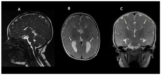 Brain magnetic resonance imaging (MRI) of the proband at age 6 months. Midsagittal FIESTA sequence (A) and axial and coronal T2-weighted sequences (B,C) show complete corpus callosum agenesis (ACC) with associated colpocephaly (B) and Viking helmet appearance of the lateral ventricles (C).